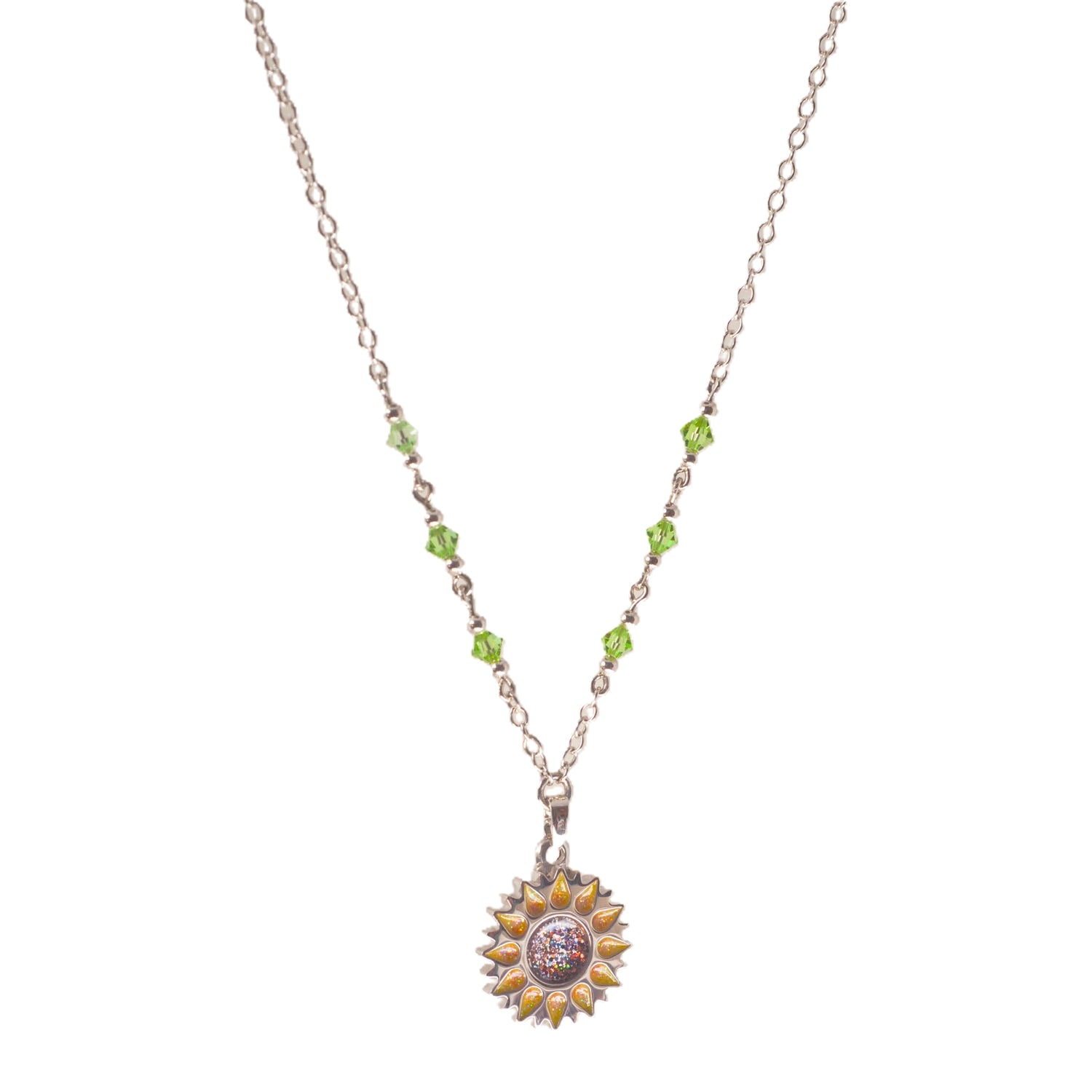 Hold the memories of your loved one close by, with our comforting Sterling Silver memorial sunflower pendant. Within the vibrant Crystallure coloured centre and petals, a small amount of your loved ones ashes, hair or fur will be placed with the greatest care and respect.