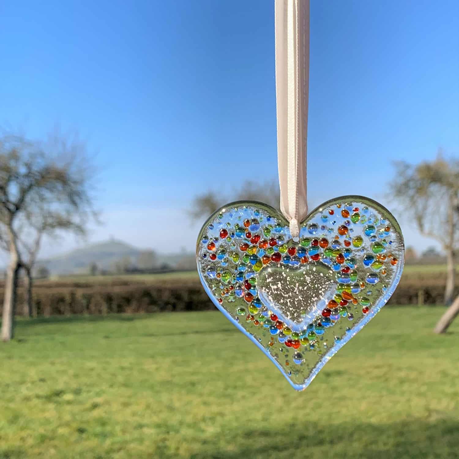 This beautiful hand-made heart glass sun-catcher measures approximately 80mm wide and 75mm long. Ashes are fused into a heart in the centre of the sub-catcher and glass ‘Jewels’ created in vibrant colour radiate out from it, which then catch the light. Available in a choice of colours and a rainbow mixture.