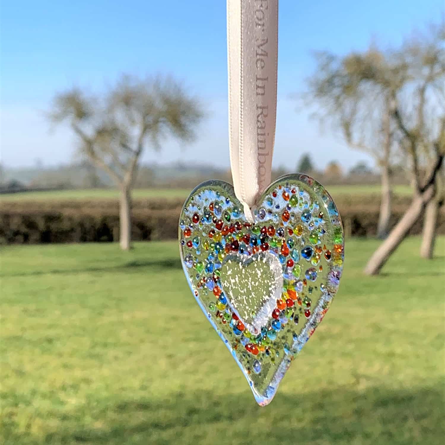 A truly enchanting memorial heart shaped glass sun-catcher suspended from a satin ribbon, making a perfect window decoration. Adding light and colour into any room, ensuring a constant reminder of your loved one.